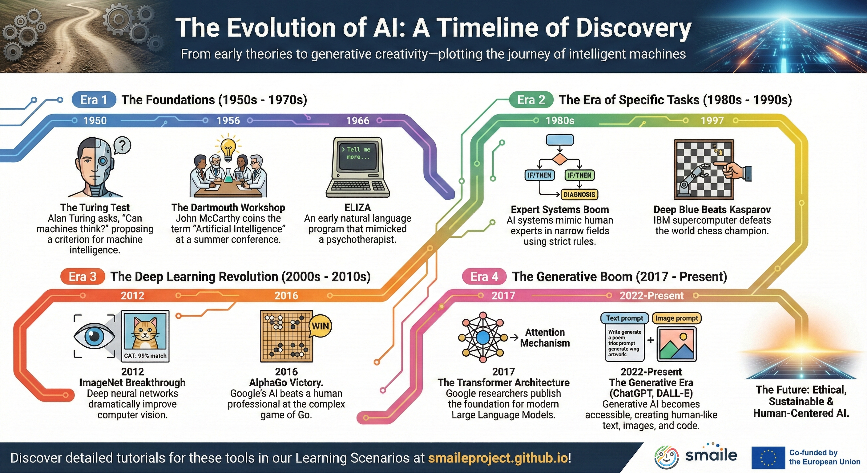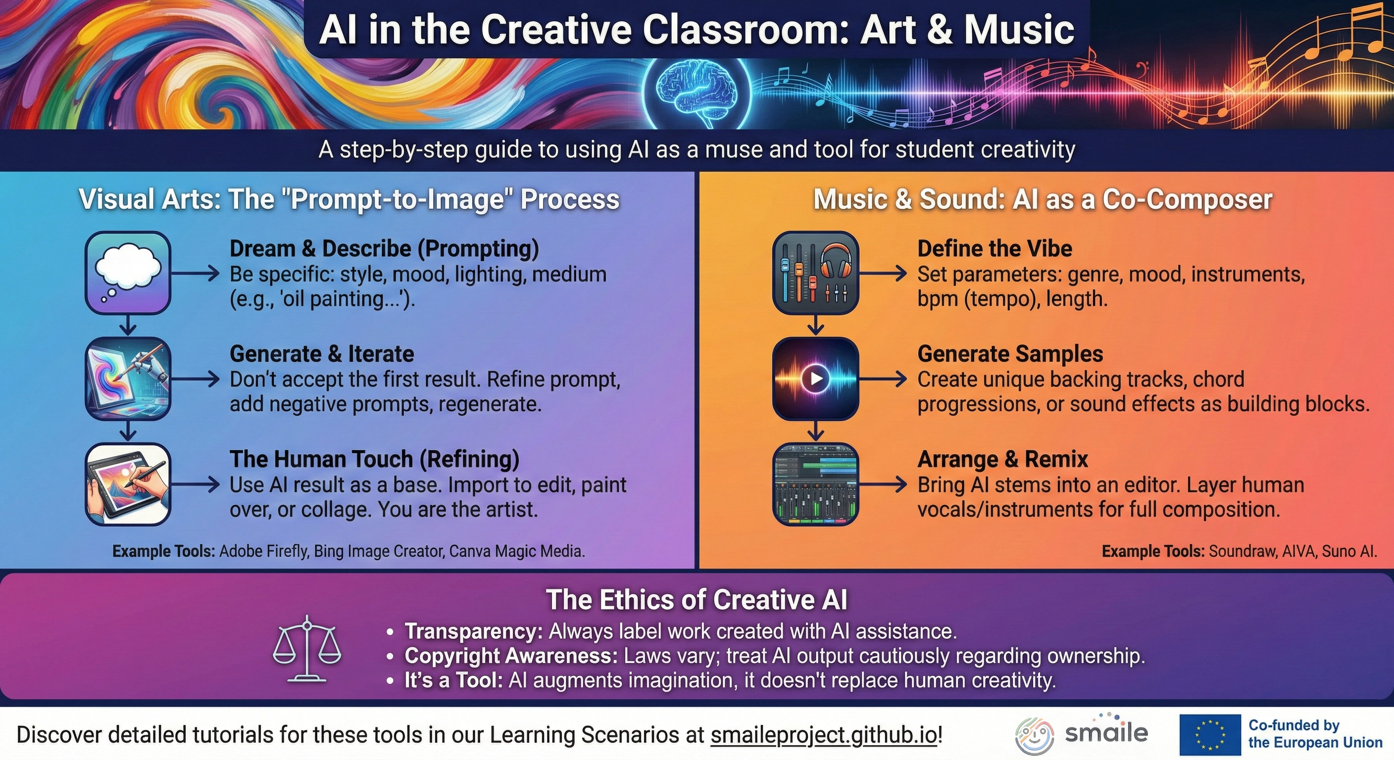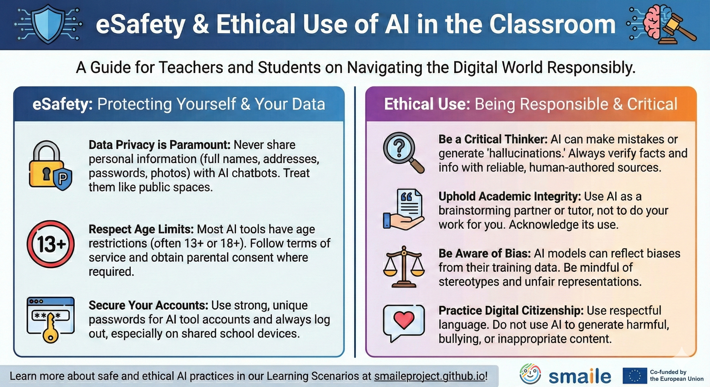 Exploring Artificial Intelligence doesn't have to be overwhelming. As part of our commitment to accessible open educational resources (OER), the SmAIle project team has developed a comprehensive series of infographics and visual tutorials. They embody our core "3E" approach—focusing on the intersection of Ethics, Environment, and Education.