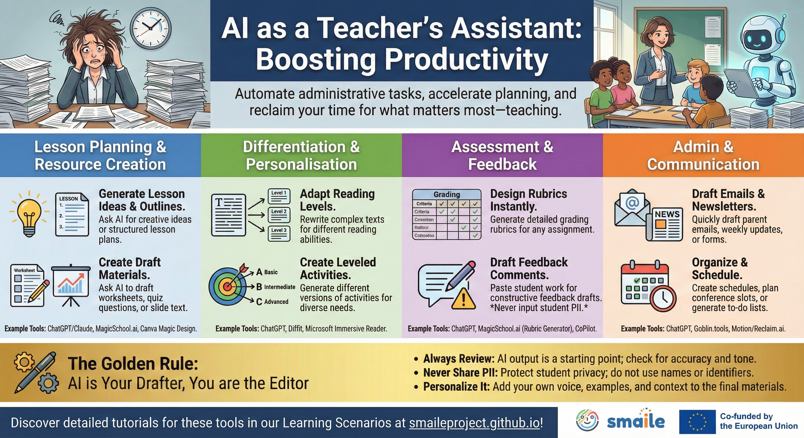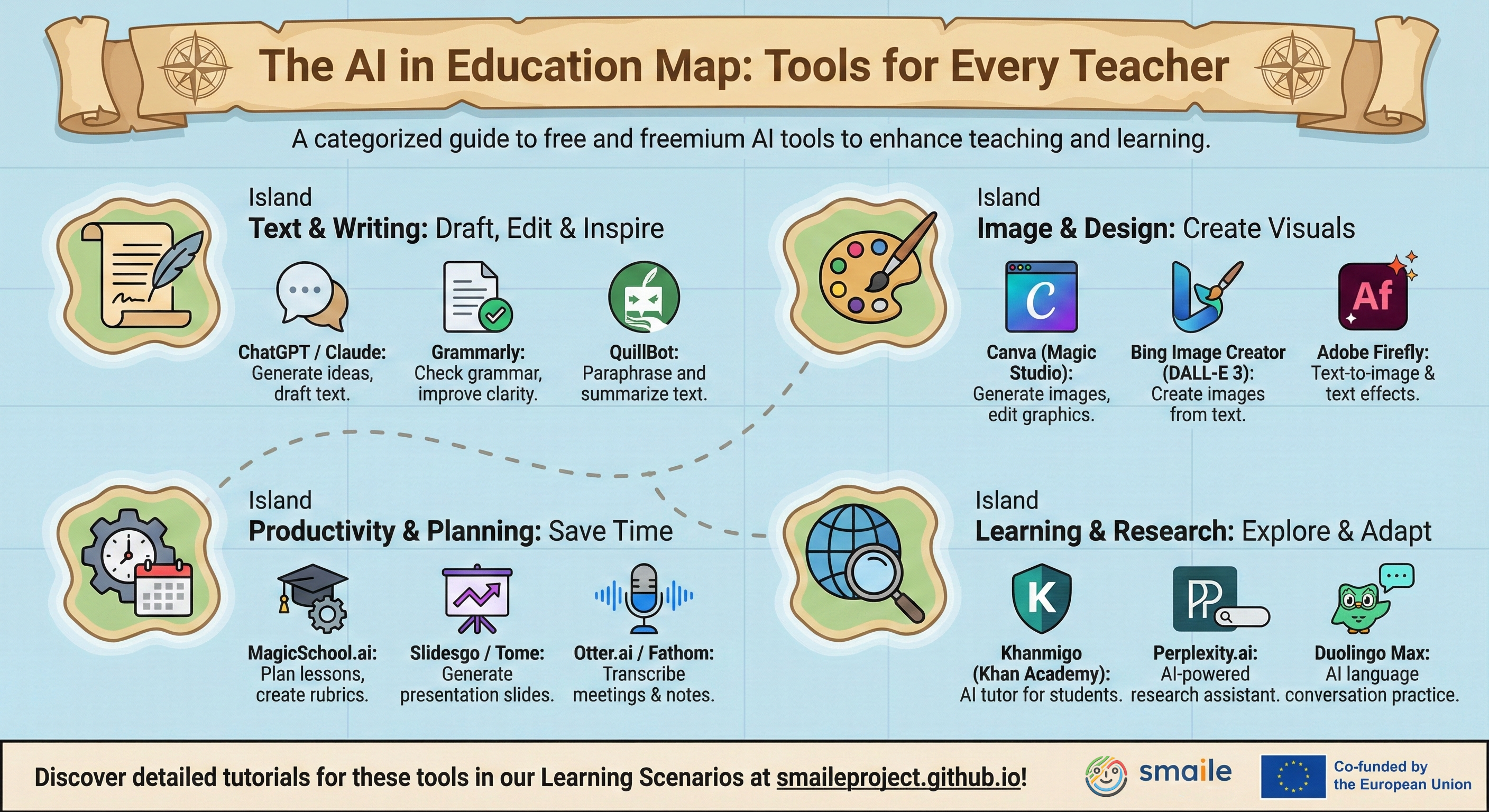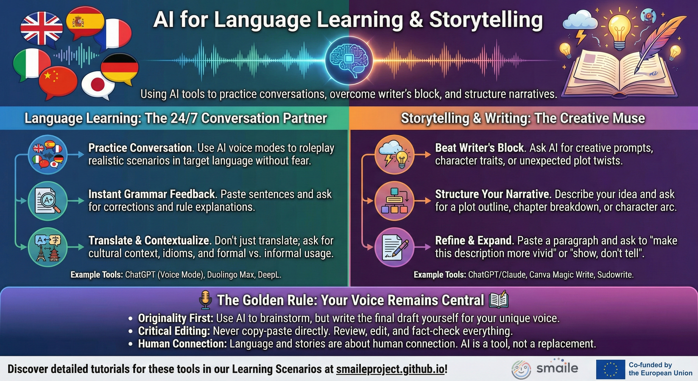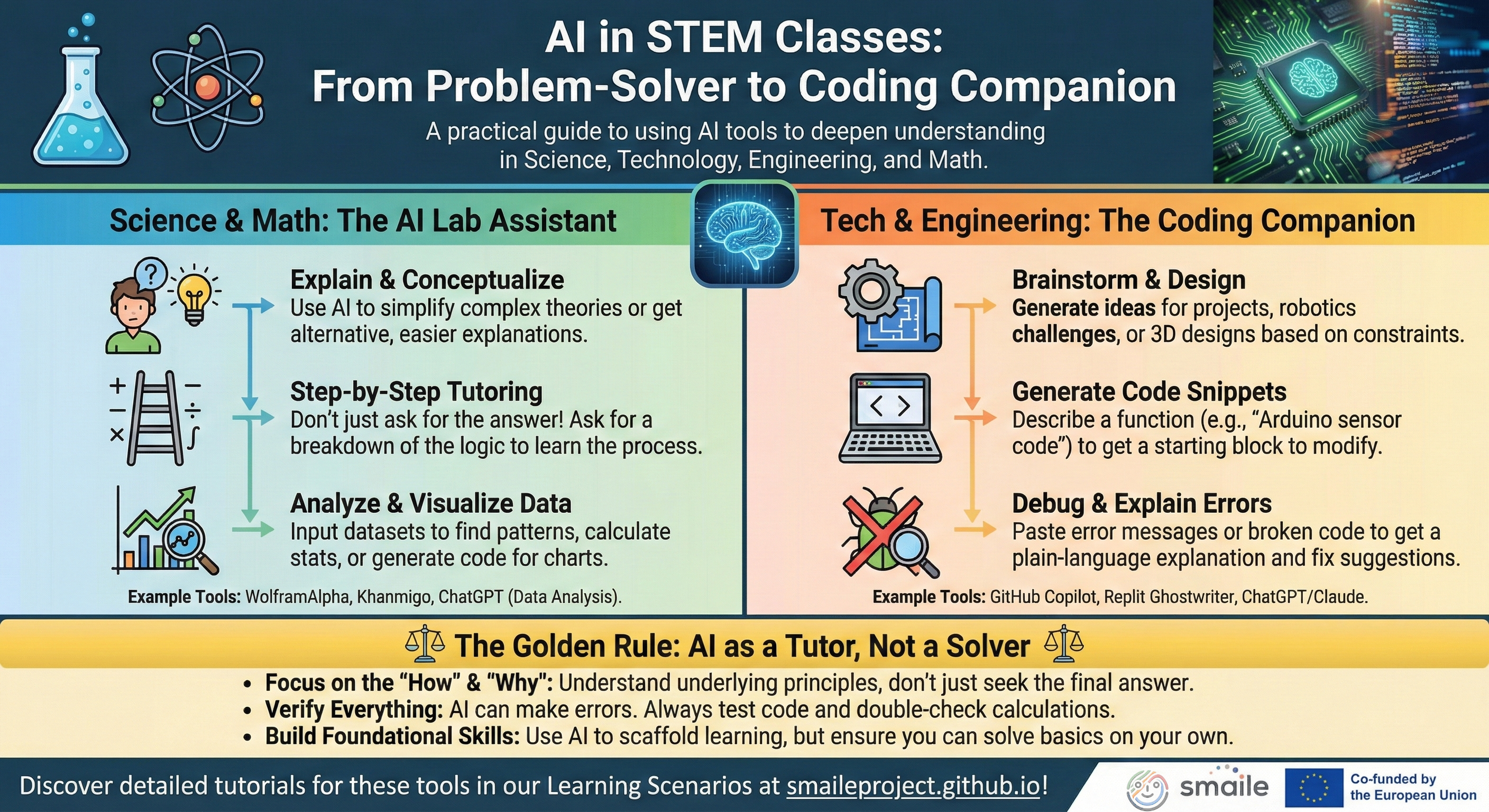 Exploring Artificial Intelligence doesn't have to be overwhelming. As part of our commitment to accessible open educational resources (OER), the SmAIle project team has developed a comprehensive series of infographics and visual tutorials. They embody our core "3E" approach—focusing on the intersection of Ethics, Environment, and Education.
